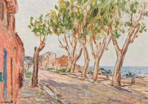 Madrigali, Olynthe. Paysage de bord de mer avec village et rangée d'arbres. Huile sur panneau, 37,5 x 50,5, signée …