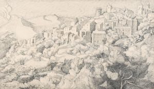 Marandet, Maurice. Rogliano. Dessin à la plume sur papier, 28,5 x 49, sous cadre.