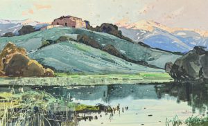 Gouache signée en bas à droite. 30 x 49, sous cadre marqueté en noyer. Légères piqûres dans le ciel