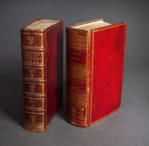 Maroquin à grain long, décor doré, roulette d’encadrement, dos long très orné et doré, tranches dorées, gardes de papier bleu clair