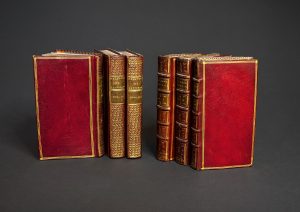 RELIURES DE L’ÉPOQUE. Maroquin rouge, décor doré, triple encadrement avec rosette aux angles, dos ornés à la grotesque, tranches dorées .