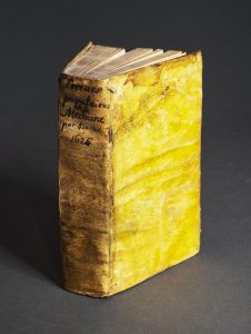 Vélin ivoire à plats souples, titre à l’encre noire en tête du dos