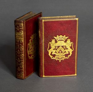Maroquin rouge, décor doré, armes au centre des plats, triple filet en encadrement avec rosette aux angles, dos long ornés et dorés, tranches dorées.