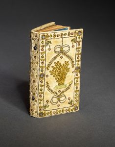 Soie brochée blanche, grand décor de fleurs, et de guirlandes, en broderie de fils d’or, d’argent et de tissu, incrustation de perles en nacre, garde et doublures de soie avec un miroir au contreplat supérieur et un portefeuille à soufflet au contreplat inférieur, seconde doublure de papier d’Augsbourg doré et rose, tranches dorées.