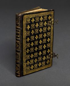 Maroquin noir, décor doré, semé au motif du chiffre “MT” et d’une fleur de lys, roulette et encadrement d’un double filet, dos à nerf avec motif alterné, tranches dorées, gardes de papier orangé, fermoirs d’argent.
