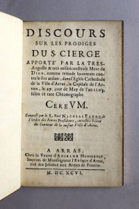 FATOU, Nicolas — Discours sur les prodiges du S. Cierge apporté par la très auguste mère de Dieu... dans l'Église cathédrale de la ville d’Arras... — Arras, Veuve d’Anselme Hudsebaut, 1696.