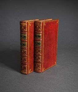Maroquin rouge, décor doré, triple filet en encadrement avec un fleuron de marguerite aux angles, dos à nerfs ornés et dorés d’une autre petite fleur, tranches dorées.