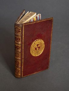 Maroquin rouge, décor doré, armes au centre des plats, fine roulette en encadrement, dos à nerfs orné et doré, tranches dorées.