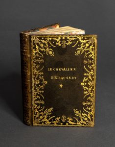 Maroquin vert, grand décor doré, nom du premier possesseur en lettres dorées au centre des plats, grande dentelle aux petits fers à motifs de fleurs et de feuillage, dos long orné et doré, tranches dorées.