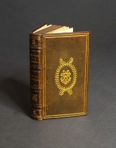 Veau vert, décor doré, armes au centre plats, encadrement de filets, dos à nerfs orné du chiffre et de la pièce d’armes, double titraison au dos, tranches dorées.