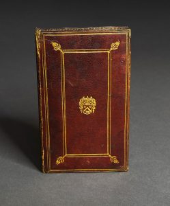 Maroquin rouge, décor doré, armes au centre des plats, double encadrement de trois filets avec un fer floral aux angles, dos long sans titre à décor de petits fers, tranches dorées.
