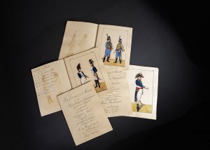 “Cet ouvrage, très rare, n’existe que dans les bibliothèques allemandes et dans celle de S. A. I. le Prince Victor Napoléon” (Glasser, p. 204). Ces planches dérivent d’une collection de costumes publiée peu auparavant dans une revue prussienne, la Preussische Armée-Uniformen.
