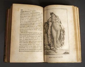 frontispice, 2 planches dépliantes dont l’une représente le Cap de Bonne Espérance, 9 planches gravées sur cuivre imprimées à pleine page (la troisième planche reliée avec le t. II) représentant des indigènes principalement des Hottentots et des girafes (2 pl.). Parmi ces planches figure celle de l'Hottentote nue qui fut supprimée ensuite (pl. VII). Elle est ici intacte. Chadenat la mentionne comme faisant souvent défaut ou comme souvent mutilée : "elle laissa détacher son petit tablier, & me permit de contempler tranquillement ce que le lecteur verra lui-même dans la Copie fidèle que j'en ai tirée" (t. II, p. 346).