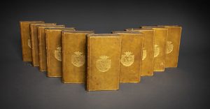 Quelques charnières fendues et coins émoussés, dos usés, quelques éclats. Quelques brunissures, petites taches ou trous de vers à l’occasion, petit manque de papier dans la marge inférieure de la p. 322 (t. 8), déchirure sans manque p. 491 au t. 9, qualité de contrastes des planches des trois premiers volumes inférieure à celle des suivants