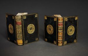 Maroquin bleu, décor doré, armes au centre des plats, triple filet avec fleurette aux angles, gros fleuron dans les angles, dos à nerfs très ornés et dorés, le premier volume avec fleurs de lys et “L” couronné, le second au chiffre Prondre de Guermantes repris en queue du volume I, pièces de titres uniformisées à l’époque, papier de garde tourniquet identique pour les deux volumes, tranches dorées sur marbrures.