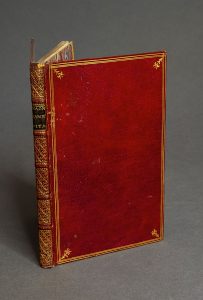 Maroquin rouge, décor doré, triple filet d’encadrement avec rosette aux angles, dos orné et doré à la grotesque, tranches dorées.