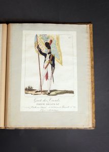 La Garde des Consuls fut créée par un arrêté de janvier 1800. Elle est la mère de la grande Garde impériale. Tout ce qui touche à la Garde des Consuls est rare, comme le confirme ici Glasser : “Cette suite fort rare donne avec beaucoup de précisions les détails du costume de la Garde des Consuls. Elle constitue un document de valeur.”