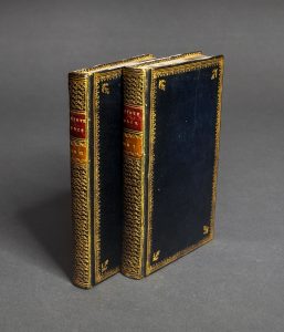 Maroquin bleu, décor doré, fine roulette d’encadrement avec une grande fleur dans chaque angle, dos long ornés et dorés d’un décor de rinceaux, tranches dorées.