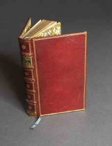 Maroquin rouge, décor doré d’un encadrement de double filets, dos à nerfs orné d’une fleurette dans les entre-nerfs, GARDES DE PAPIER D’AUGSBOURG À MOTIFS D’OISEAU ET DE LIBELLULES, tranches dorées.