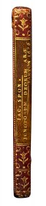 Maroquin rouge, décor doré, triple filet en encadrement avec rosette aux angles, dos long orné et doré, titraison longitudinale avec une longue pièce de titre de maroquin citron, tranches dorées.