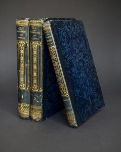 RELIURES VERS 1820 SIGNÉES DE HERVÉ. Dos de veau bleu, lisses, très ornés et dorés d’un motif à plaques et fers, non rogné, avec tous ses témoins et les planches à toutes marges.