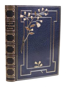 ABOUT (Edmond). Les Mariages de Paris. Paris, A. Lahure, 1887. In-8, maroquin bleu, bouquets de fleurs blanches …