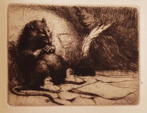 Les Mémoires d'un rat. – Les Commentaires de Ferdinand. Paris, Daniel Niestlé, 1920-1921. 2 volumes in-8, maroquin brun avec coins, tête dorée, non rogné, couverture et dos (Yseux sc de Thierry-Simier). Premières éditions illustrées de 70 eaux-fortes tirées en bistre par Tigrane Polat (1874-1954), c'est-à-dire 36 gravures pour les Mémoires et 34 (et non 38 comme mentionné sur le titre) pour les Commentaires. L'histoire raconte la capture d'un rat par un Poilu de la Première Guerre mondiale puis l'amitié qui va développer entre eux. Cet ouvrage métaphorique fut publié anonymement en 1917 et interdit par les Allemands.