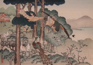 Fables. Paris, Linrairie Marpon & Flammarion, [1898]. 2 séries en un volume in-4 oblong, bradel cartonnage de soie bleue brochée, dos lisse, couverture et dos (Reliure postérieure). Ouvrage comprenant 2 couvertures illustrées et 28 planches en couleurs réalisées par des artistes japonais sous la direction de P. Barboutau.