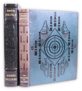 FRANCE (Anatole). Pierre Nozière. Paris, Kieffer, 1925. In-4, maroquin ébène, dos et plats ornés d'un important décor à froid de soleil, fleurs et arbres, tête dorée, non rogné, couverture et dos. 20 eaux-fortes d'Auguste Vigoureux. _x000B_Un des 450 exemplaires numérotés sur vélin blanc.