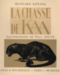 La Chasse de Kaa. Paris, Javal et Bourdeaux, 1930. In-4, maroquin bleu marine, filet doré encadrant les plats, dos orné de filets dorés et mosaïqué de listels de peau de reptile beige et verte, couverture et dos (Reliure de l'époque). Édition illustrée de 115 compositions en couleurs de Paul Jouve, dont 21 à pleine page, gravées sur bois par Camille Beltrand assistée de Pierre Bouchet.