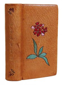 Sylvie. Paris, Lubineau, 1944. In-12, maroquin havane, fleur mosaïquée de maroquin rose, grenat et vert, dos lisse, doublure et gardes de soie grenat, tête dorée, couverture et dos (Reliure de l'époque). Édition illustrée de 20 eaux-fortes originales de Marianne Clouzot, de nombreuses lettrines, culs-de-lampe gravés sur bois par Gérard Angiolini.