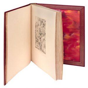 Les Contes. Paris, Au sans pareil, 1928. In-4, maroquin rouge janséniste, multiples filets intérieurs, tranches dorées, non rogné, couverture et dos, étui (Ed. Klein). Édition ornée de 11 gravures hors texte, dont la couverture, de 11 lithographies originales et 11 gravures sur bois en deux tons par 33 artistes tels que A. Alexeieff, Yves Alix, André Dignimont, Pierre Falké, Démétrius Galanis, Louis Jou, Alfred Latour et Frans Masereel.