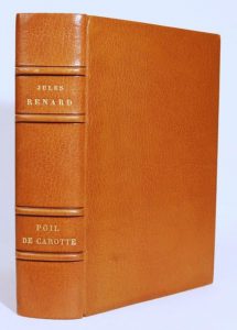 Poil de Carotte. Paris, Collection des dix, A. Romagnol, 1911. Fort in-4, maroquin lavallière, cadre intérieur orné de filets et d'une guirlande dorée, doublure et gardes de moire marron, tête dorée, couverture et dos, étui (Flammarion). Édition illustrée de 52 eaux-fortes en noir à pleine page ou en bandeau d'Alméry Lobel-Riche.
