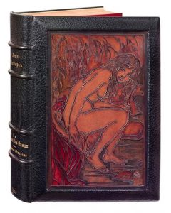 La Chanson des gueux. Dernières Chansons. Paris, Édouard Pelletan, 1910. 2 tomes en un volume in-4, maroquin noir, plaque de cuir incisé enchâssée représentant une jeune femme nue assise près d'un ruisseau, dos orné du titre doré, multiples filets dorés et listel de maroquin rouge mosaïqué intérieurs, tranches dorées, couverture et dos, chemise et étui (René Aussourd). Premier tirage des compositions originales de Théophile-Alexandre Steinlen (respectivement 252 et 24), gravées sur bois en noir par Ducourtioux et édition intégrale pour le premier ; édition originale pour le second.
