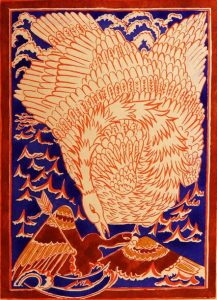 Conte de Tsar Saltan et de son fils le glorieux et puissant prince Guidon Saltanovitch et sa belle princesse Cygne. Paris, La Sirène, 1921. In-8, en feuilles, chemise illustrée de l'éditeur. Édition originale de cette traduction entièrement illustrée de compositions à pleine page, d'encadrements et de lettrines par Natalia Gontcharova, mis en couleurs par les ateliers Marty.