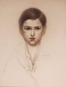 Le visage du garçon aux yeux sombres est tracé en détails, le costume à peine esquissé.
