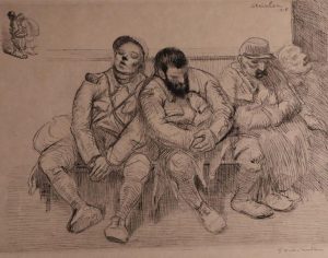 Entre deux trains. 1916. Sur japon avec remarques, représentant des soldats endormis. Signée et justifiée 56/100 au crayon (25x32,5 cm). Deuxième exemplaire annoté "1er état III".