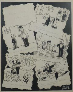 Pour rire entre vous. 2 dessins originaux. [années 1930]. Sujet : 44 x 35 cm, sous passe-partout, verre, cadre. Deux grands dessins humoristiques à l'encre de Chine sur papier.