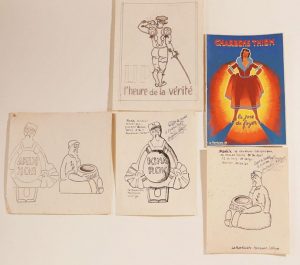 – deux esquisses pour un modèle de cendrier publicitaire en céramique, Nectar assis et Kinarok (14 x 25 cm et 25 x 18 cm. 23 mars 1951), signées La Martinière, Marchand, Lafarge.