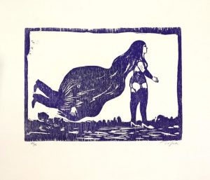 Hommage à Félicien Rops. Gravure sur bois. 45,5 x 56 cm la feuille, 21 x 30 cm la gravure. Composition tirée en bleu nuit. Épreuve numérotée 49/75 et signée au crayon par l'artiste.