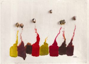 Travail de sept escargots. [1977]. 98 x 73 cm. Aquarelle sur papier japon, coquilles d'escargot et résine, dans un emboîtage de plexiglas.