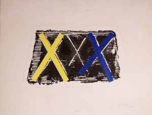 Franchir l'espace. Lithographie encadrée d'un texte manuscrit. Numérotée III et signée par Michel Butor et Pouperon. (30 x 33cm).