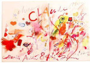 Bonne Année 84. Carte de vœux décorée à Claude Pompidou. 22 XX 1983. Une page in-4 (21 x 29,5 cm ; encadrée). Carte de vœux « chère Claude Merci Bonne Année 84 votre Jean », ornée de collages : plumes, rubans, scoubidous ; de gommettes : cœurs, étoiles, pastilles et de notes de couleurs à l’encre et au crayon. Le tout en plusieurs tons fushia, rose, jaune, vert et orange fluorescent forme une composition très vive évoquant des feux d’artifices.