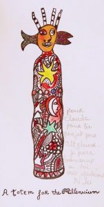 A totem for the Millennium. Lithographie avec envoi autographe signé à Claude Pompidou. S.l.n.d. [2000]. 27,5 x 14,5 cm. Lithographie en couleurs avec collage de deux autocollants.