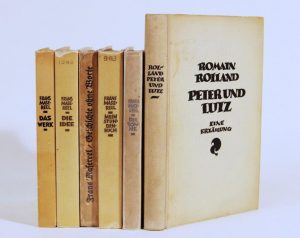 Ensemble 6 ouvrages en version allemande. ROLLAND (Romain). Peter und Luiz. Eine Erzählung. Munich, Kurt Wolff, 1921. In-12, demi-toile beige, dos lisse, tranches noires, cartonnage de l'éditeur. Illustrations par Frans Masereel.