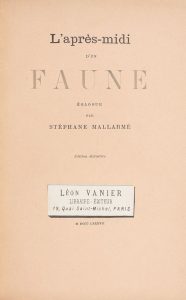 MALLARMÉ (Stéphane). L’Après-midi d’un faune. Églogue par Stéphane Mallarmé. Édition définitive. Paris : La Revue indépendante, 1882 (1887). — In- 8, 11 pp. , (2 ff.), couverture imprimée. Maroquin janséniste bleu à long grain,...