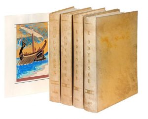 L'Odyssée. Paris, Les Bibliophiles de l’Automobile-Club de France, 1930-1933. 4 volumes in-4, en feuilles, chemises et étuis en vélin de l'éditeur. Traduction de Victor Bérard, décorée et ornée de 100 compositions dont 75 hors-texte par François-Louis Schmied, gravées sur bois par Théo Schmied et mises en couleurs par Saudé.
