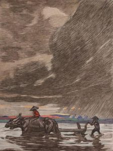 Un Pèlerin d’Angkor. Paris, Paul Jouve, François-Louis Schmied, 1930. In-4, en feuilles, couverture, chemise et étui. Superbe édition illustrée de 62 compositions de Paul Jouve gravées sur bois en couleurs par François-Louis Schmied qui a également assuré l’impression. On compte 13 lettrines, 13 ornements, 13 bandeaux, 11 culs-de-lampe, 10 planches et 2 compositions sur double page.