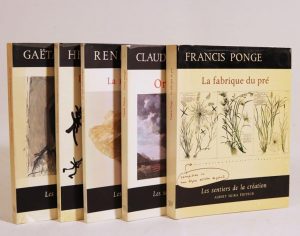 Ensemble 5 ouvrages. Genève, Albert Skira, 1970-1972. 5 volumes in-8 carré, brochés. Ensemble de cinq titres en édition originale : Gaëtan PICON. Admirable tremblement du temps. – Claude SIMON. Orion aveugle. – Francis PONGE. La Fabrique du pré. – René CHAR. La Nuit talismanique. – Henri MICHAUX. Emergences-Résurgences.