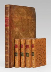 Paris, Plassans, an VI (1798), pour le texte;Paris, Imprimerie de la République, an V (1797), pour l'atlas. Quatre volumes in-8 de (2) ff., LXVIII, 368 pp.; (2) ff., 414 pp.; 316 pp., (74) ff.; (2) ff., 328 pp., reliés à l'époque en veau marbré, dos ornés avec pièces de titre de maroquin rouge et de tomaison de maroquin bleu, tranches mouchetées; et un atlas in-folio en demi-veau fauve de l'époque, dos lisse orné, pièces de titre de maroquin rouge.